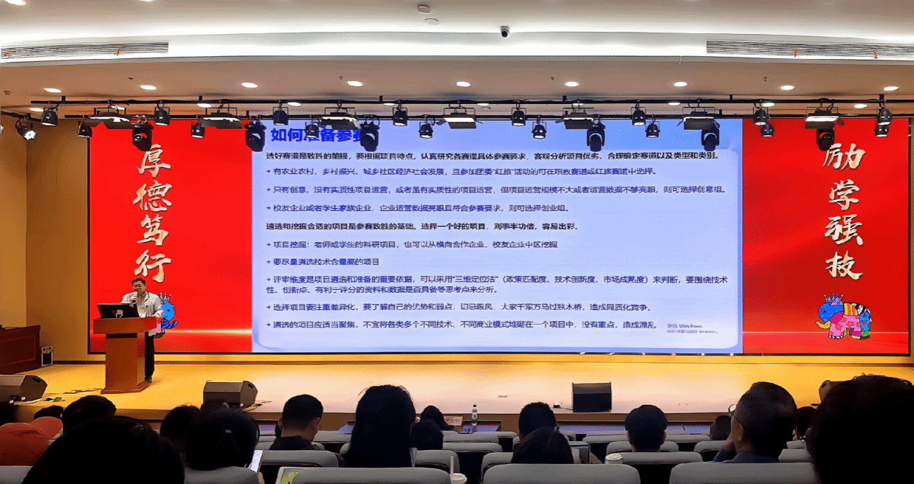 讲座中,裴老师凭借其丰富的国赛评审经验和深厚的专业素养,直击备赛核心环节,通过对比分析往届获奖案例与常见误区,就如何提炼项目亮点、强化逻辑论证、规范文本格式等方面给出了具体而中肯的建议。