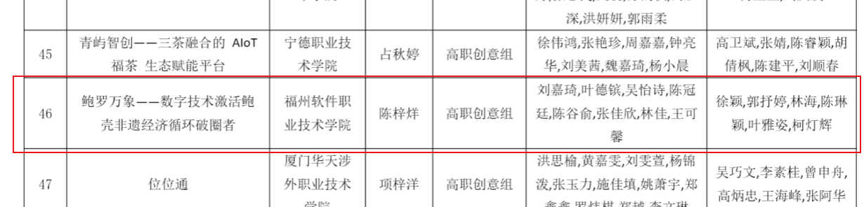 我校数字影视传媒产业学院与游戏产业学院共同参与的《鲍罗万象——数字技术激活鲍壳非遗经济循环破圈者》,在本次大赛中获得职教赛道暨第九届黄炎培海峡职业教育创新创业大赛银奖。(指导教师:徐颖、郭抒婷、林海、陈琳颖、叶雅姿、柯灯辉,参赛学生:陈梓烊、刘嘉琦、叶德镔、吴怡诗、陈冠廷、陈谷俞、张佳欣、林佳、王可馨)